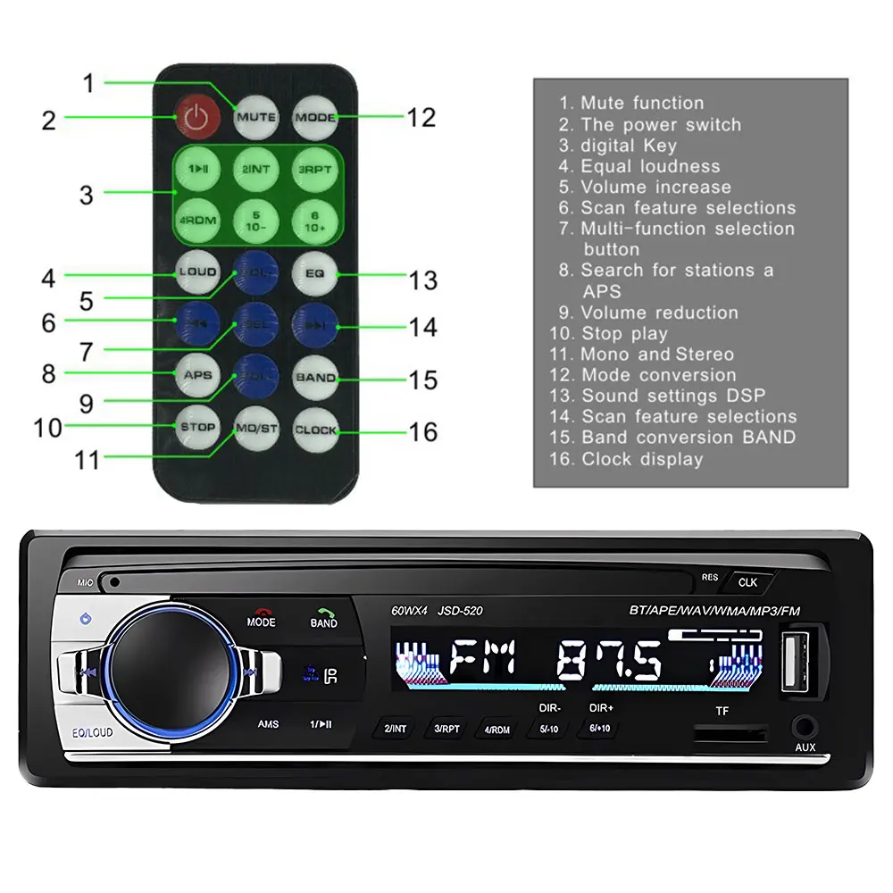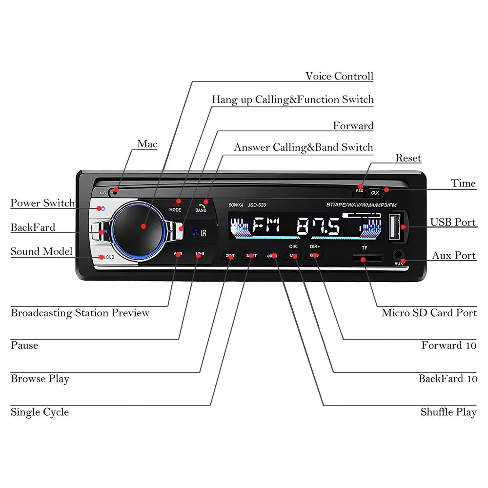 * Electronic tuning and radio function, automatic station closing and saving, support power-off memory;