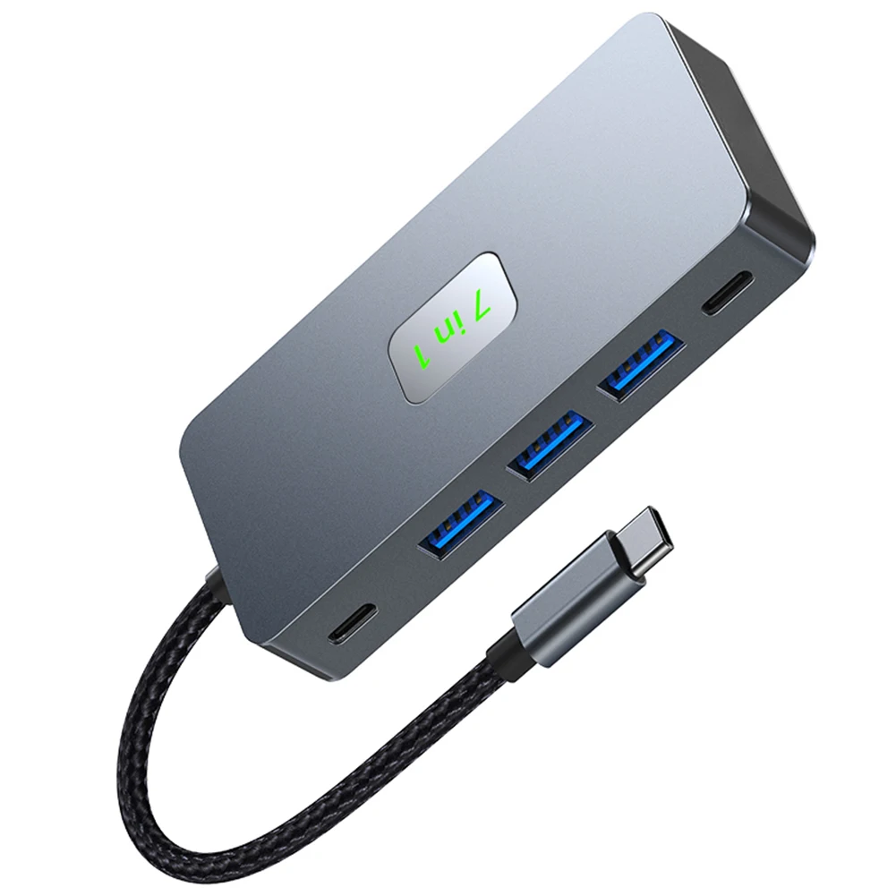 Feature: 1. 7-in-1 Laptop Docking Station: This docking station USB-C hub features 7 ports, including dual 4K HDMI-Compatible outputs, a PD100W port, and 3 USB 3.0 ports. Plug-and-play functionality ensures you can expand your workspace without any drivers or software. 2. Dual 4K HDMI-Compatible Support: Our USB-C dock includes two HDMI-Compatible ports for mirroring or extending displays. Connect monitors, projectors, or HDTVs with resolutions up to 4K at 30Hz, enhancing your productivity with dual-screen capabilities (note: MacBook supports mirror mode only). 3. Ultra-Fast Data Transfer: Equipped with 3 USB 3.0 ports, this USB-C hub offers fast data transfer speeds of up to 5Gbps. Transfer a 1GB file in just 2 seconds and connect your devices like smartphones and external hard drives without lag. 4. 100W Power Delivery: The USB-C adapter provides a Type-C pass-through port to safely charge your connected laptop with up to 100W power delivery. Enjoy uninterrupted performance without worrying about battery life during intensive tasks. 5. Broad Compatibility: This docking station is compatible with all USB-C laptops, including those with Thunderbolt 3 and 4, as well as USB-C 3.1 Gen 1, Gen 2, and USB-C 3.2 Gen 1 and 2. Perfect for various models, including Compatible with Dell XPS and HP EliteBook series. Specification: Origin: Mainland China Interface Type: USB 3.0 Ports: 7 Standard: USB 3.0 Funtion: HDMI-compatible Product size: 100.00×45.00×15.00mm Product size: 3.94×1.77×0.59inch Color: gray Material: aluminum alloy Uplink interface: Type-C Transmission speed: 5Gbps Provided interfaces: 2*4K/30Hz HD interface, 1*PD100W interface, 3*USB3.0 interface, 1*USB-C data port Note: ![]() 1 x USB C Docking Station