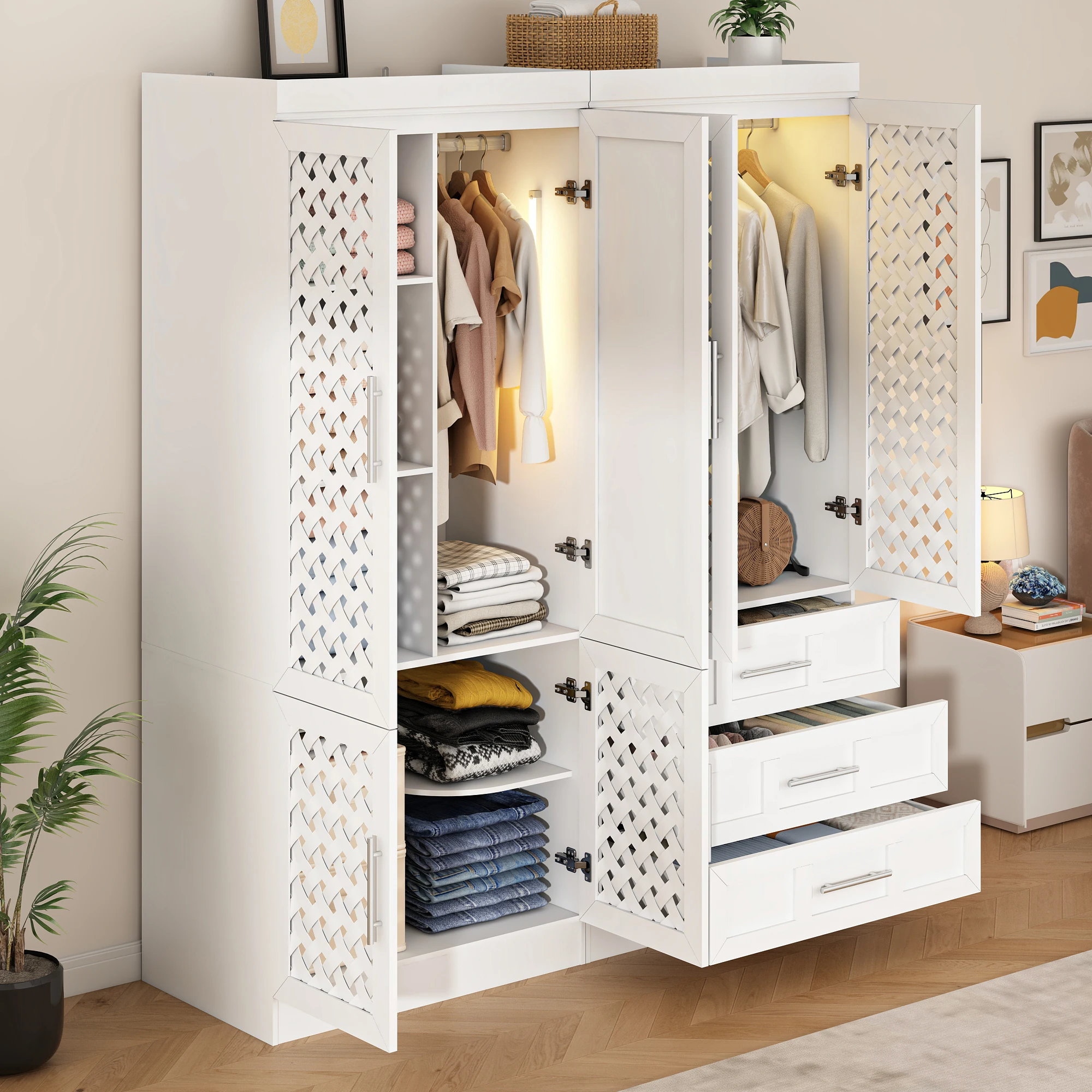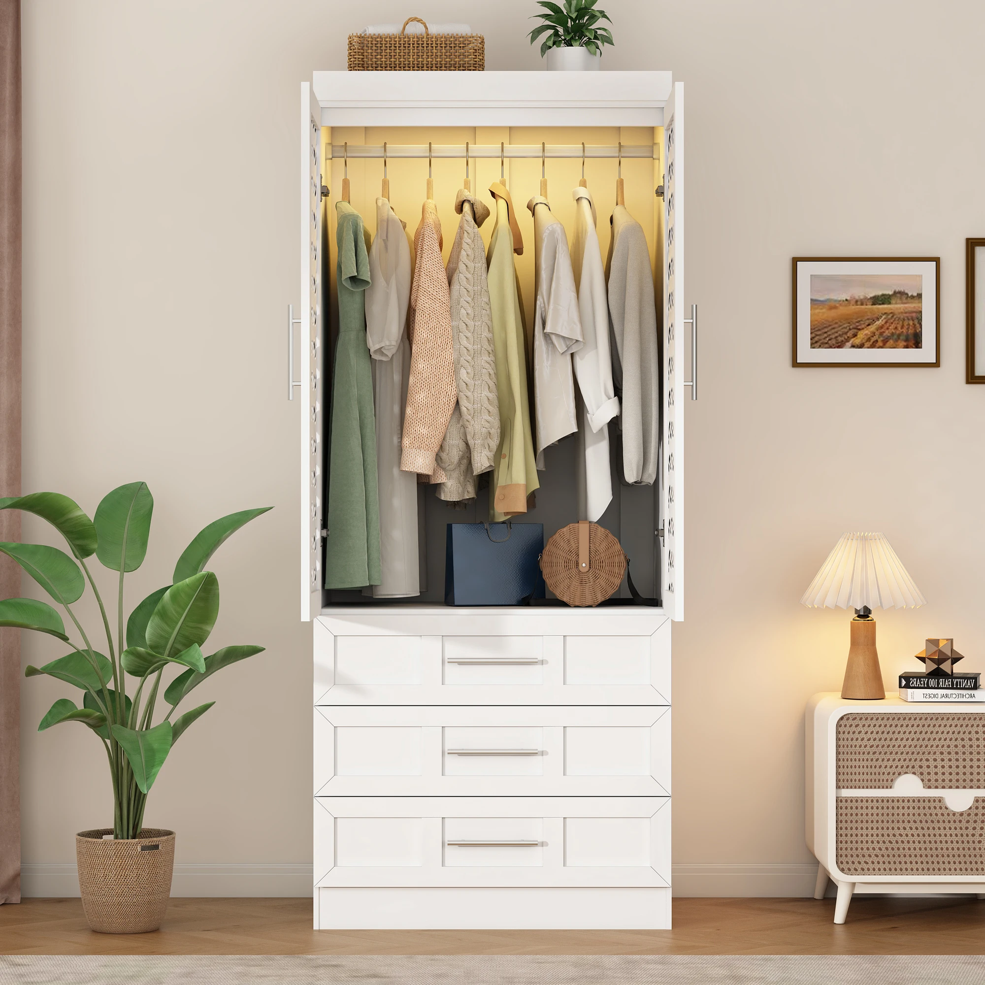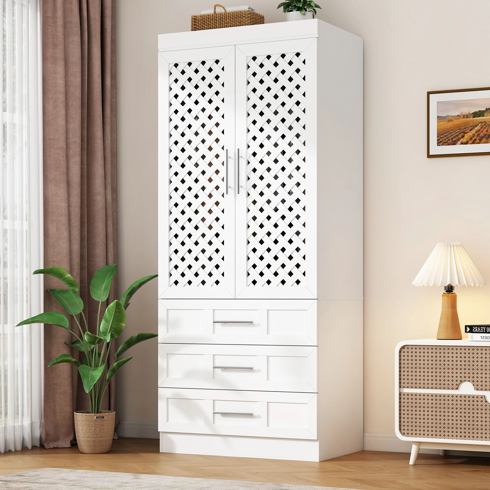 Modern Home Style: White bedroom armoires adopts fashionable modern style, rattan cabinet doors with both design and practicality, in line with home aesthetics, wardrobe closet with doors can be perfectly integrated with a variety of decorative styles, add home atmosphere, enhance the sense of aesthetics of the home.