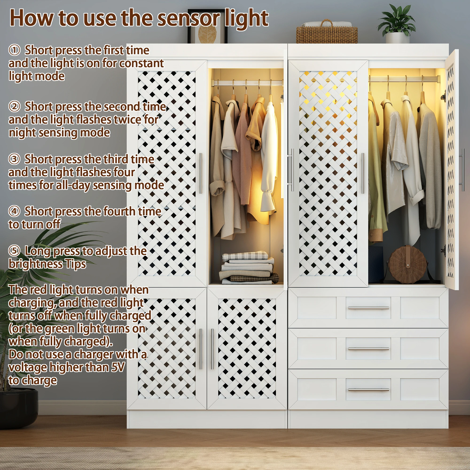 Practical And Considerate Design: Bedroom armoires wide-angle hinge design, door opening and closing amplitude, access to more convenient; with rust-resistant metal handles, open and close smoothly, labor-saving, comfortable grip, armarios de ropa para dormitorio built-in smart LED lights, dim environment visual friendly, easy to identify different clothing.