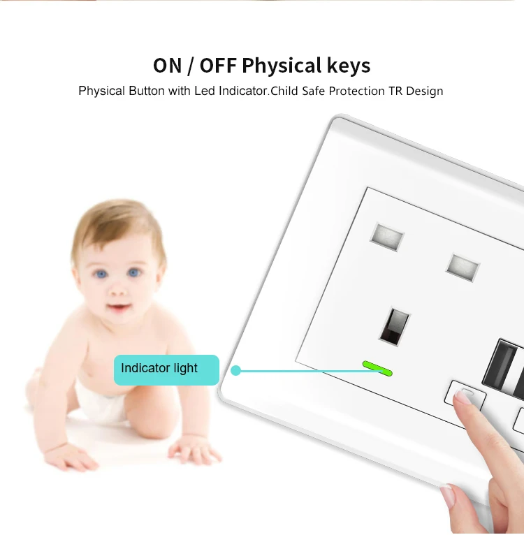 Physical button with led indicator.child safe protection TR design,You can check the on and off status of the socket through the status of the indicator light