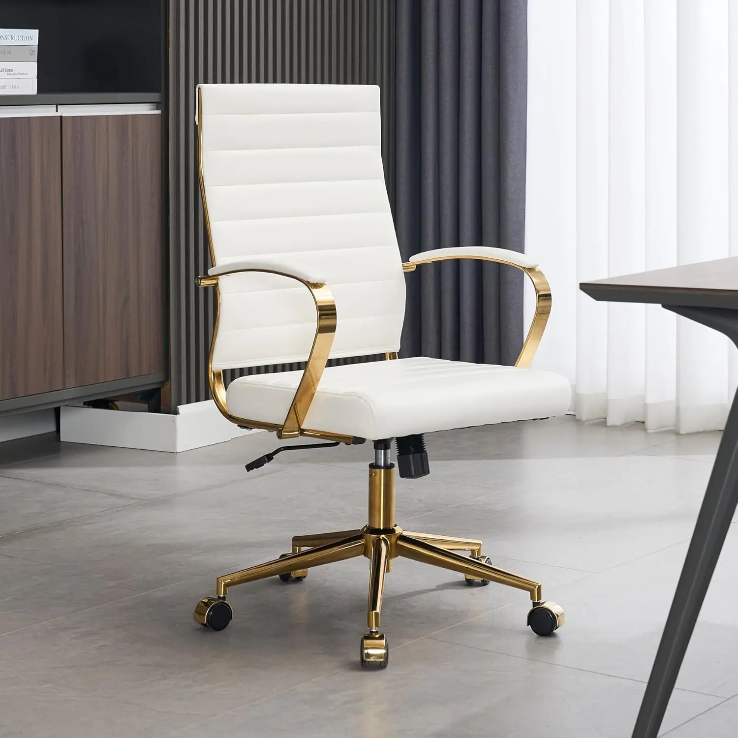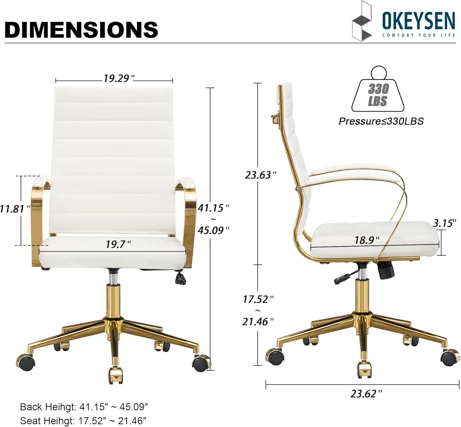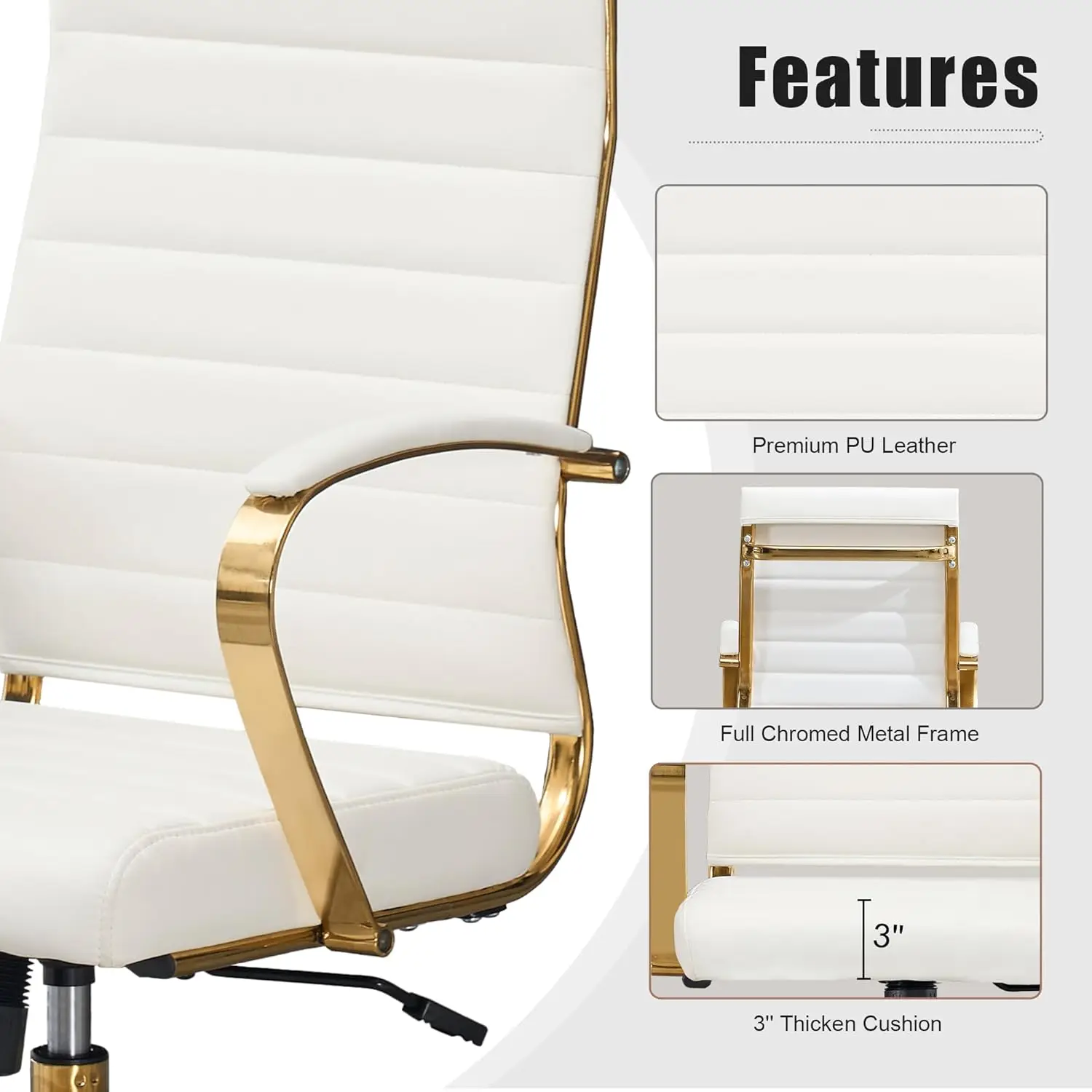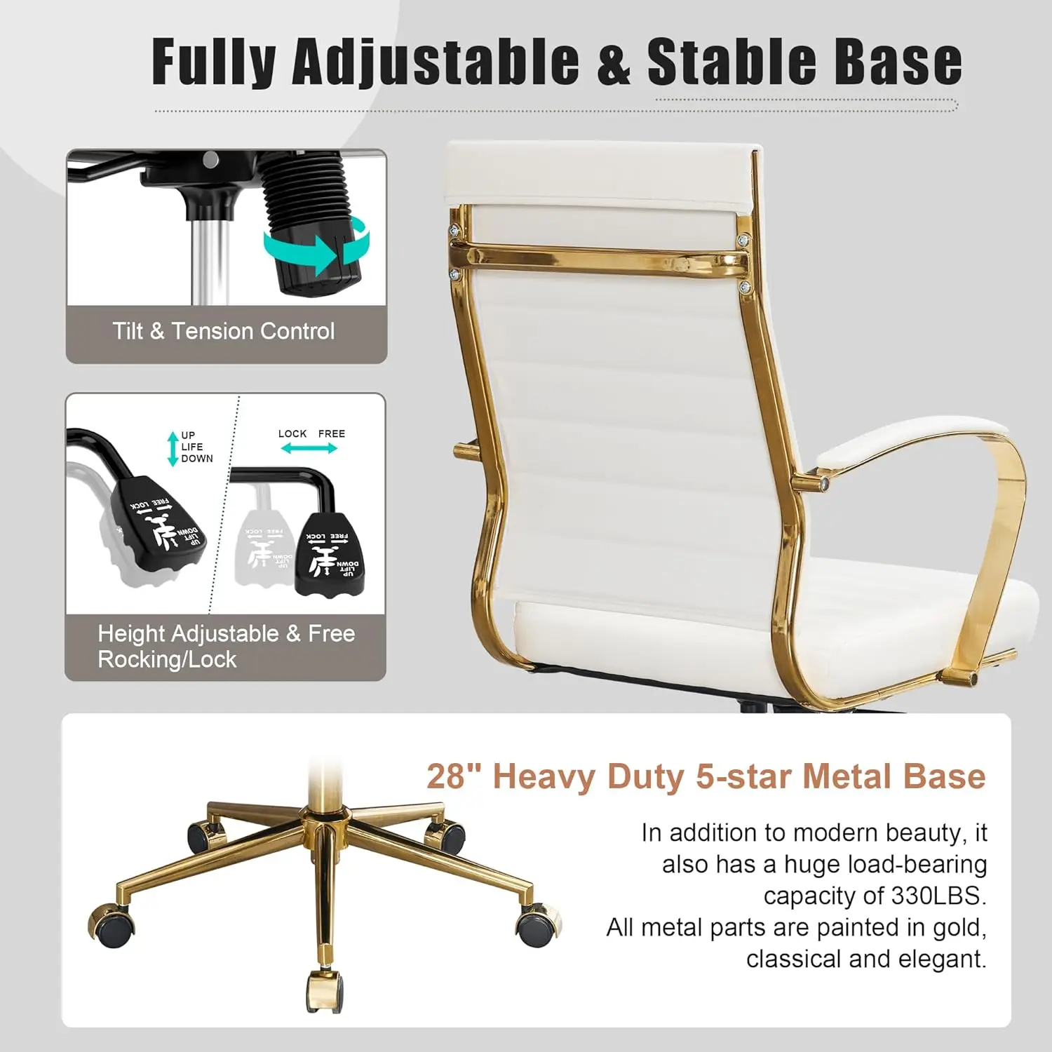 【Modern Stylish & Gold Design】Modern simple design, excellence of balancing beauty of leather with golden steel, shows off clean lines and a sophisticated presence. Add a elegant & stylish touch to your workplace, this modern golden office desk chair is the ideal addition to any workspace. 【Ergonomic comfort】 Ergonomically curved design, proper lumber support ideally support your back, maintain your posture and prevent back pain. Upgraded Thicken Cushion made from premium quality high density thick sponge, the wear-resistant PU leather surface brings you extra cozy feelings. 【Fully Adjustable】 Simple one-touch pneumatic height adjustor allows you to easily modify the chair’s height, help you get free from neck and eye strain.Easy switch to rocking mode by operating the tilt handle, relax you from heavy work. 【Multi-Function & Construction】 Smooth-rolling casters offer a versatile range of mobility, chair swivels 360 degrees .Accent by sleek metal pentagonal base & chair Frame provides a sturdy construction and ensures a long time use. 【Dimensions & Easy Assemble】Height: 41.15″ – 45.09”; Seat Height: 17.52” – 21.46”; Seat: 19.69”W x 18.9”L. Capacity:330lbs. Easy to install, All necessary hardware and instructions included, instruction with delicate design make it easy to assemble. Estimated assembly time is 15-20 minutes.