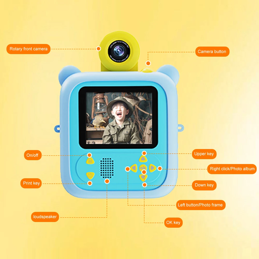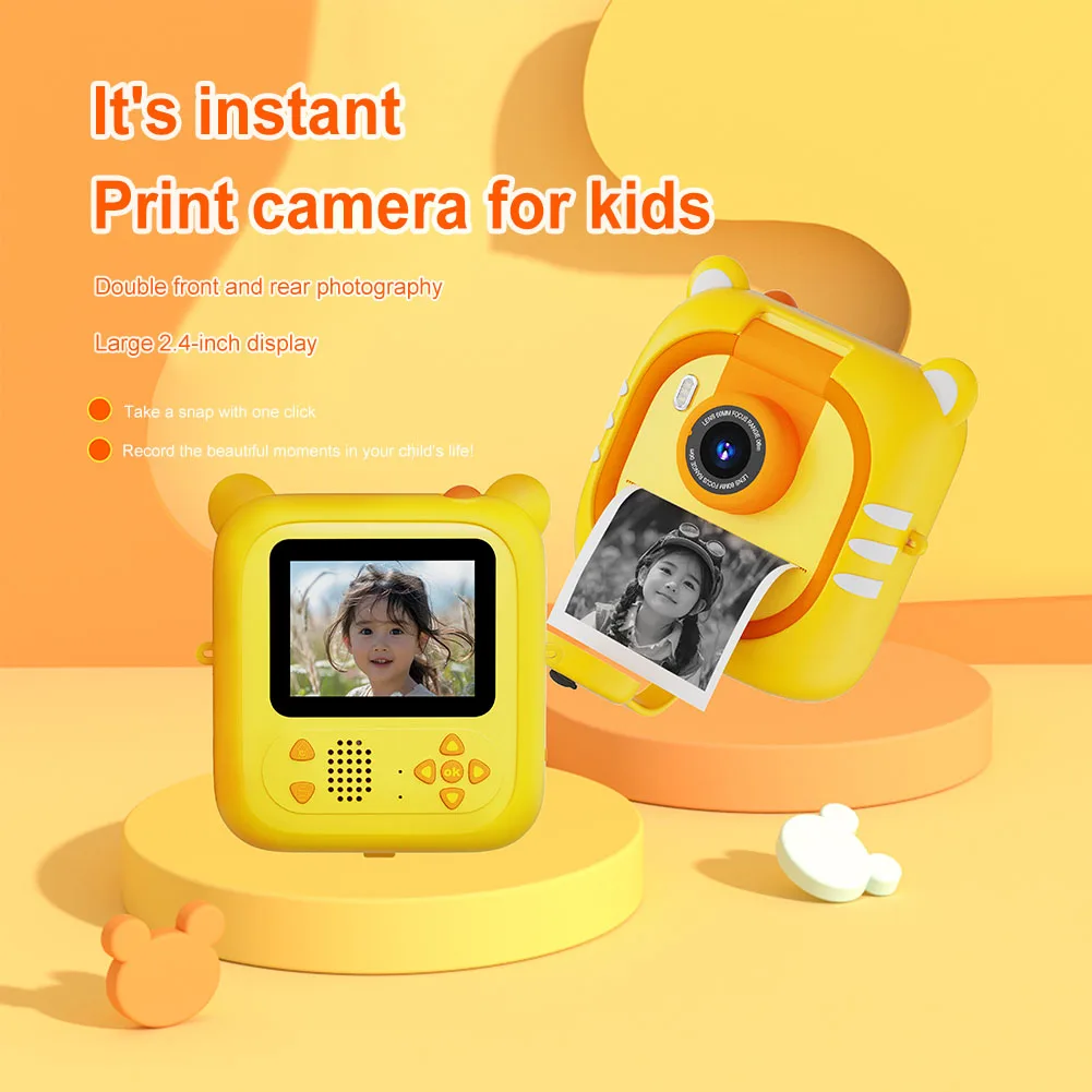 Feature: 1. Colorful Print Fun: The kids instant print camera is both a digital camera and an instant color printer for children. Capture favorite moments with a click and print vibrant photos instantly, offering endless fun and creativity. 2. Dual Lens with HD Video: Our toddler HD digital video cameras feature dual front and rear lenses with a 180° rotating design. Capture from multiple angles and enjoy 1080P video on a 2.4-inch large screen, gentle on young eyes. 3. Portable with Long Battery Life: Equipped with a 1300mAh lithium battery, the children digital camera offers extended playtime and easy charging via USB, ensuring your child never misses a moment of fun. 4. Safe Thermal Printing: The thermal print camera uses safe materials with advanced thermal printing technology. Free from toner, odorless, and non-toxic, it ensures a safe and comfortable experience for children, with a shockproof shell for added protection. 5. Perfect Gift for Kids: The instant photo printing camera is an ideal gift for children aged 3-12. Perfect for Christmas, birthdays, and other celebrations, it lets kids capture joyful moments at family gatherings, school camps, and outdoor adventures. Specification: Note: