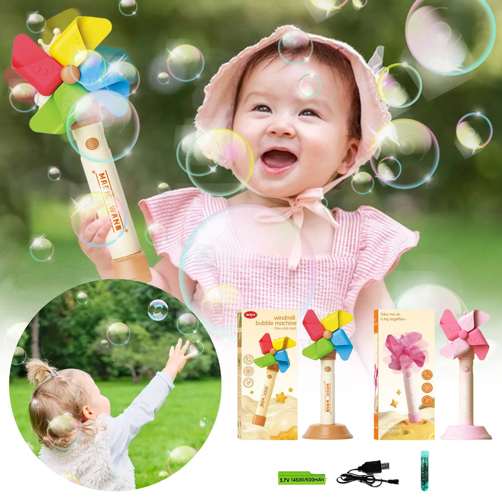 Windmill Bubble Machine for Kids – Portable Battery-Operated Bubble Blower Toy with Rechargeable Lithium Battery, 1 Bubble Solution, USB , & Gift Box – Perfect for Indoor/Outd